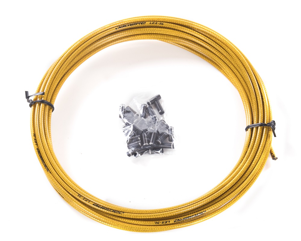 Pancerz linki przerzutki JAGWIRE LEX-SL / pancerz wzmacniany oplotem z polimeru / wewnętrzna rurka L3 wypełniona na całej długości smarem syntetycznym / 4mmx10m / w komplecie 30 szt. końcówek / kolor złoty