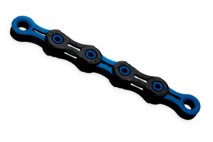 Łańcuch 11-biegowy KMC DLC11 / 1/2"x11/128" / do wszystkich napędów 11-biegowych / diamentowa trwałość / powierzchniowo utwardzany / super lekki (~227g/110 ogniw) / drążone sworznie / przecinane wewnętrzne i zewnętrzne płytki ogniw / konstrukcja Double X-Bridge zwiększająca szybkość, gładkość i precyzję zmiany przełożenia / 118 ogniw / zapinka komplecie / czarno-niebieski