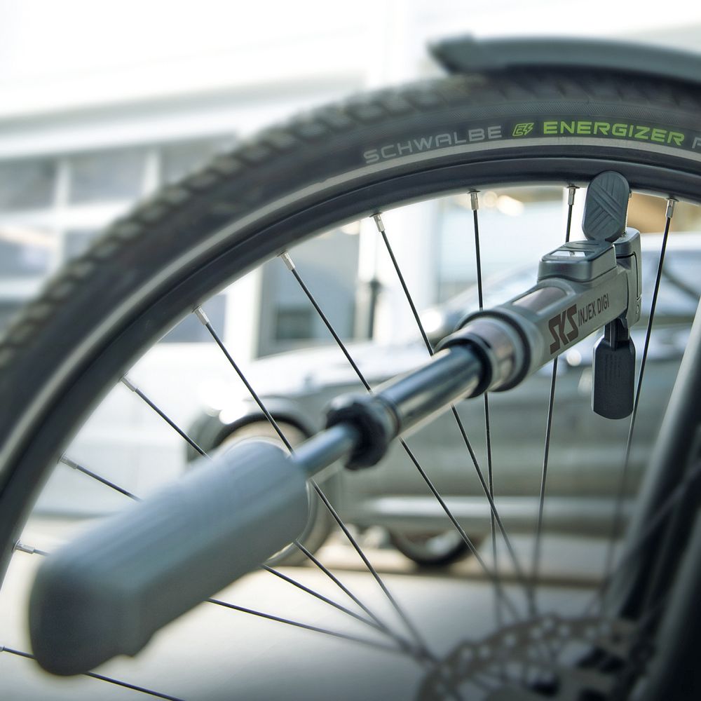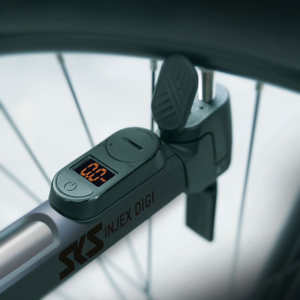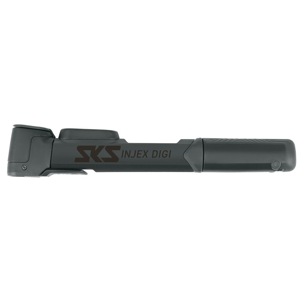 Pompka SKS Injex DIGI / L:290mm, teleskopowa / 10bar/145PSI / rura z aluminium / głowica MV Easy do wszystkich zaworów, z dźwignią blokującą, odchylona o 5 st. dla łatwiejszego pompowania / rękojeść w kształcie litery T / uchwyt mocujący do ramy / elektroniczny wskaźnik ciśnienia / 216g / czarna